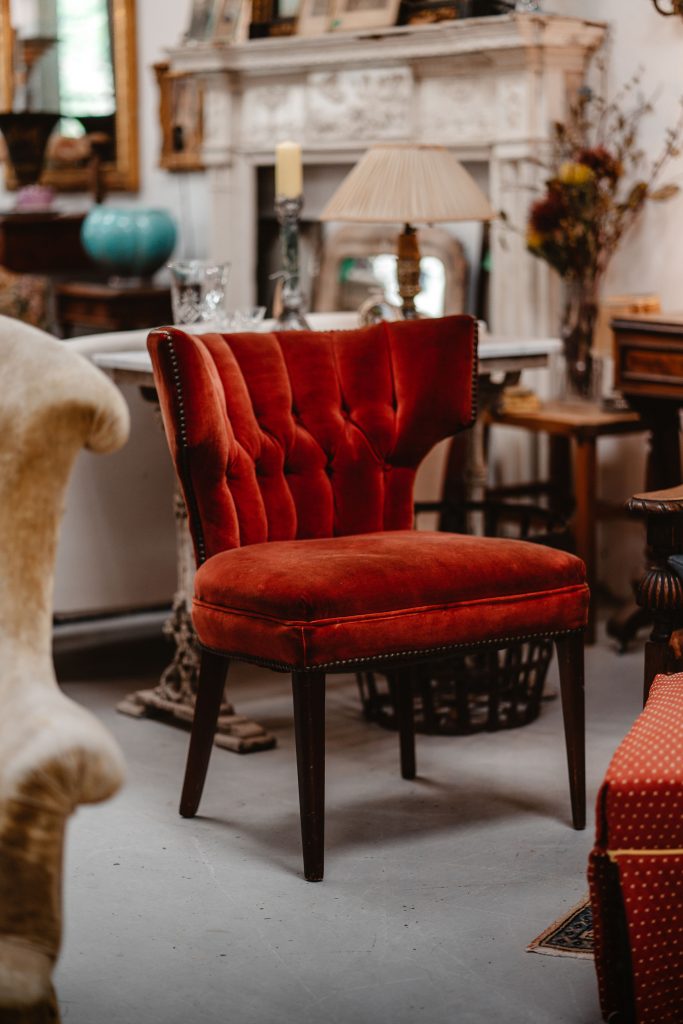 We buy pieces often for their shape, even if they need to be completely reupholstered, but we also buy more plainer items, such as a simple shaped fireside chair for its stunning red tapestry upholstery. A simple piece of furniture with a bold fabric can be just as sophisticated and striking as a uniquely shaped item with a neutral fabric.