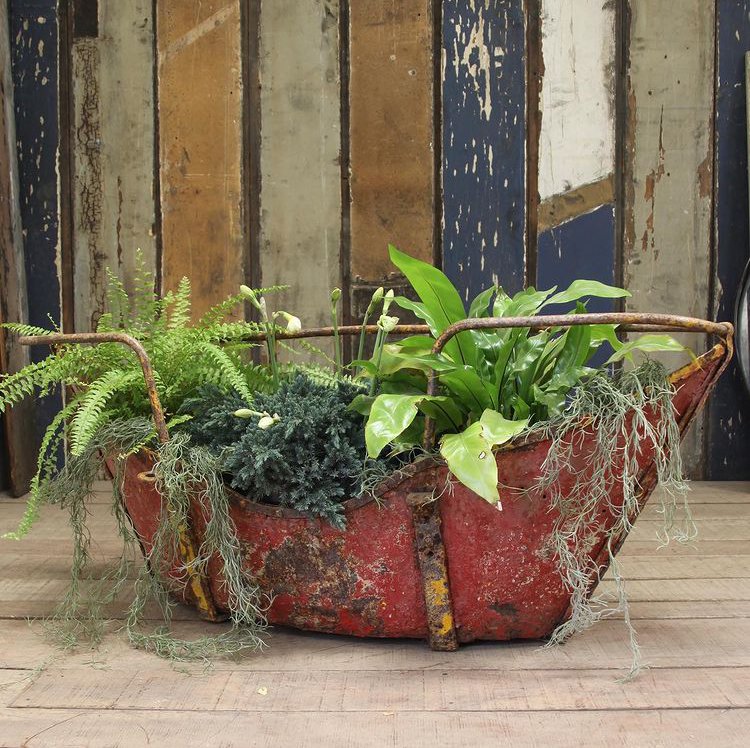 Another essential for the French inspired home is greenery and flowers. They don’t have to be fresh; we have some wonderful dried and silk flowers we use for decoration in the showroom and at home. These can last for years and are a great alternative if you don’t have green fingers but want to add some colour to a space. We also have lots of house plants in interesting French planters, as well as some are in other objects that we are using as planters – like this former fairground carousel boat (below, left) turned into a charming planter. We love to improvise!