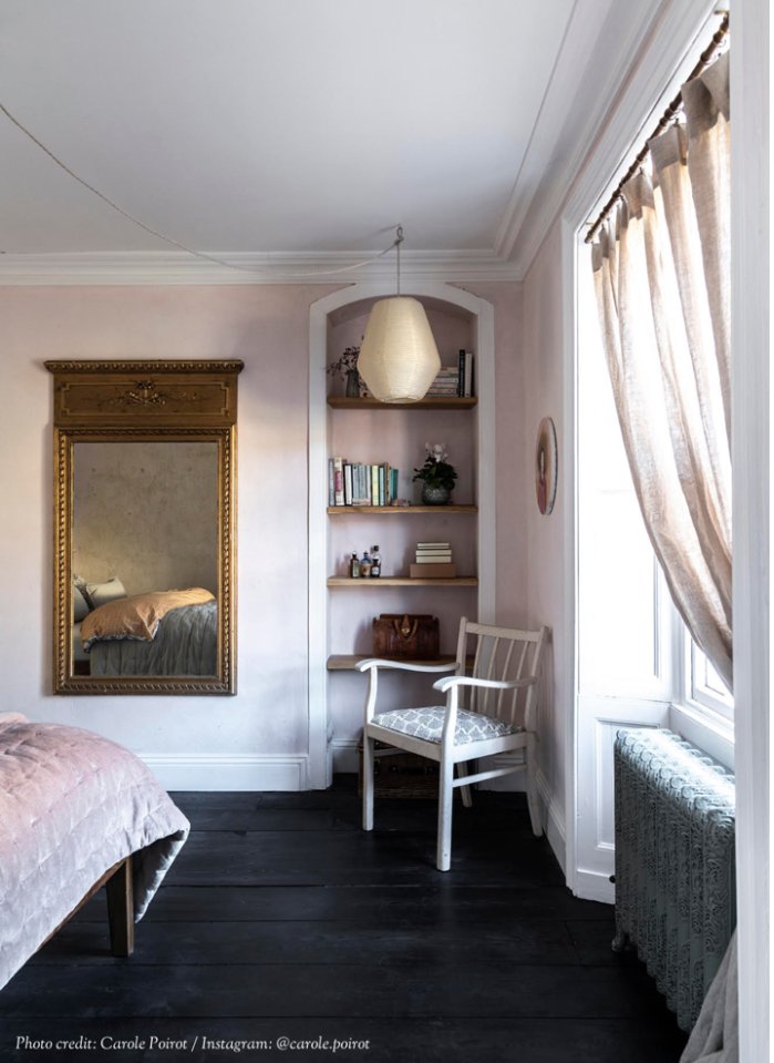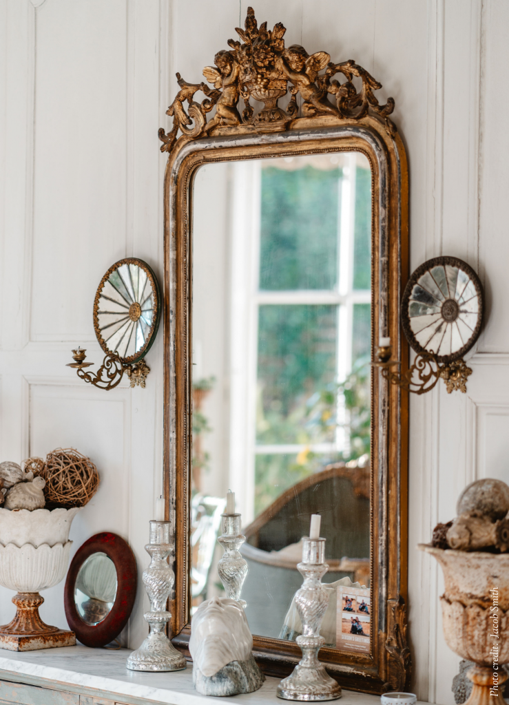 On a fireplace, on a wall or standing on the floor, no French living room or bedroom is complete without a large mirror. In our home we have mirrors everywhere – not for vanity (!), but because we think they are like hanging art. Some of the antique mirrors we find have visible signs of ageing known as ‘foxing’ creating beautiful intricate patterns. A mirror adds personality and a focal point to a room, and creates dimension, making the room feel more spacious. For the French look, it works best with a clean white wall and wooden floors.